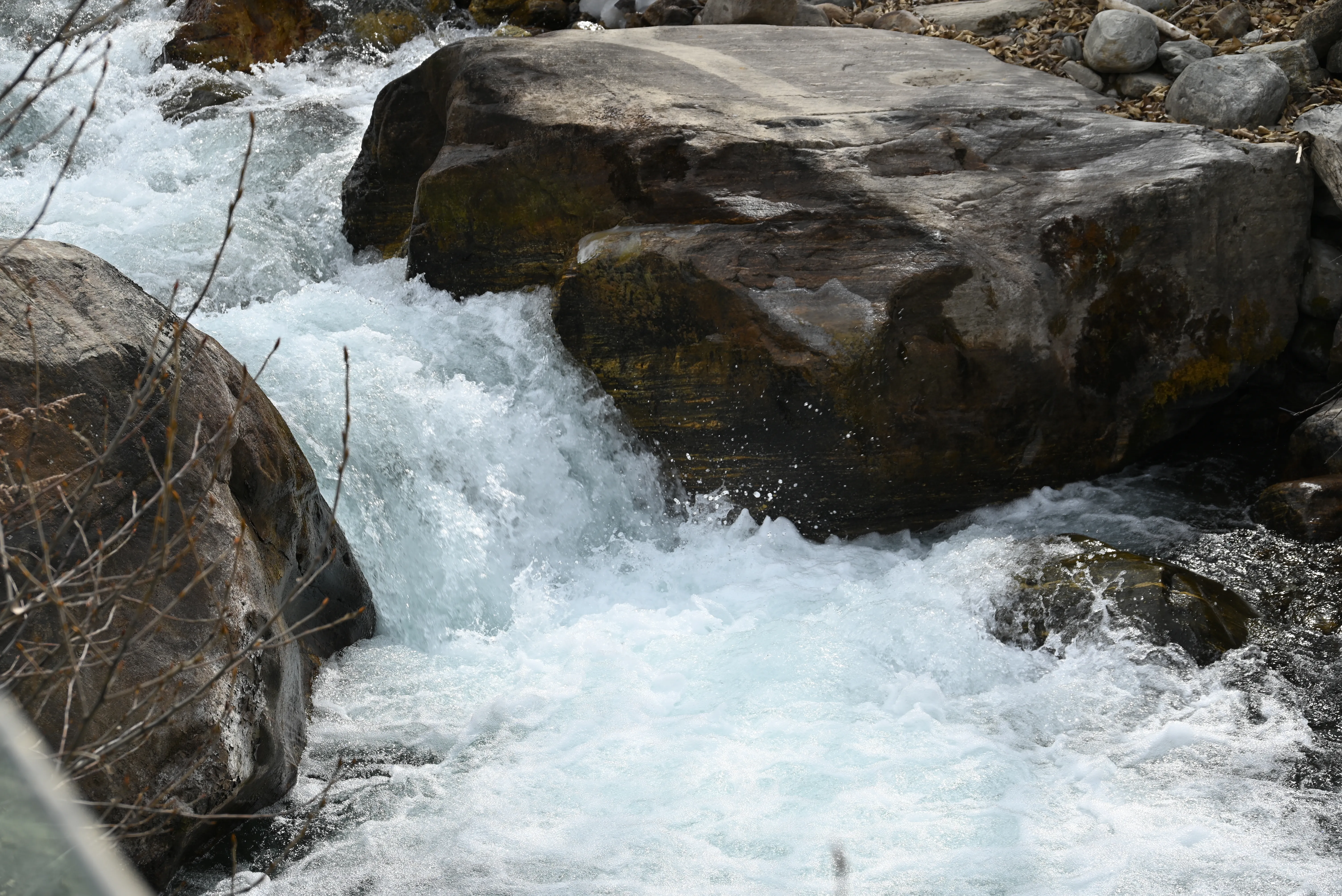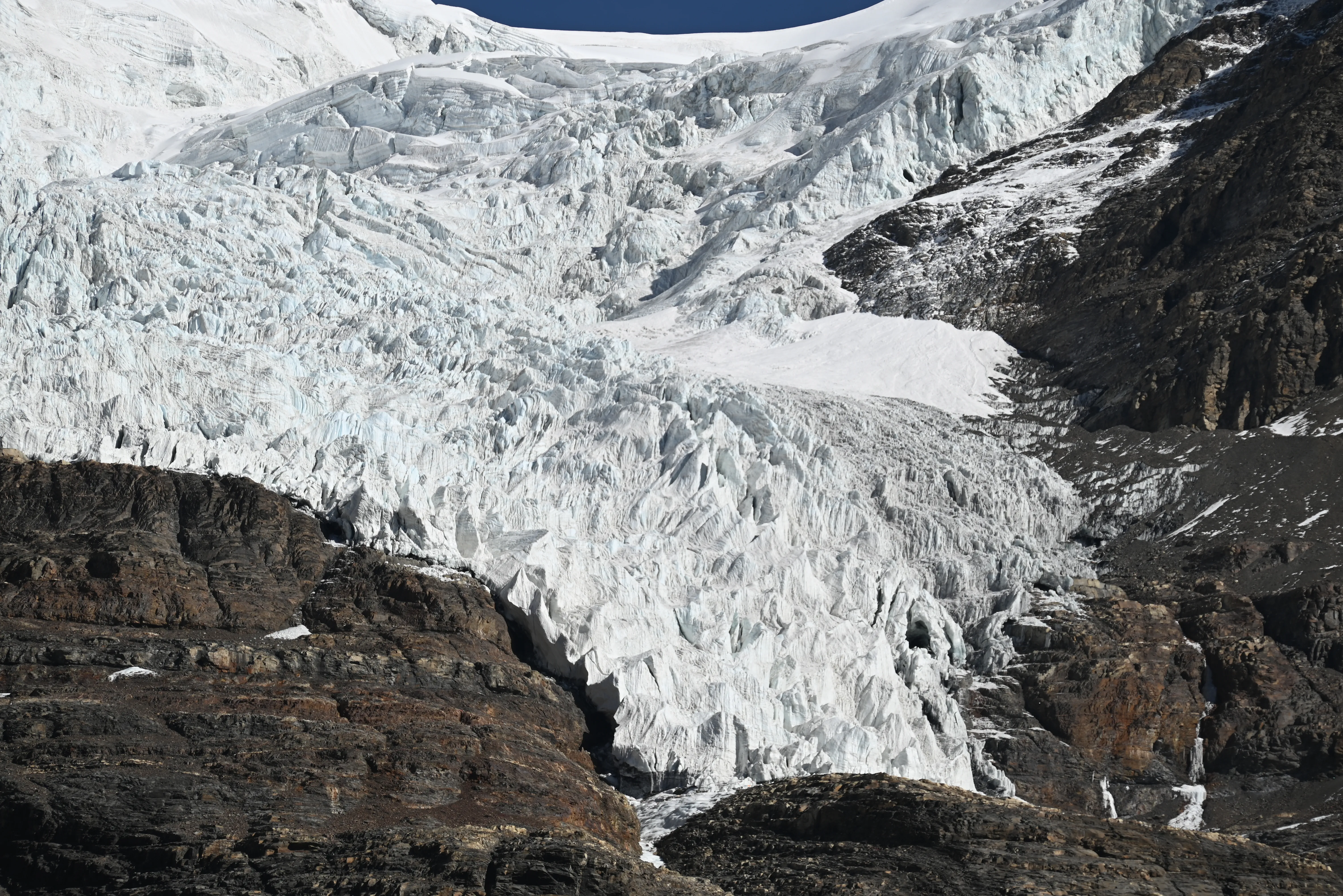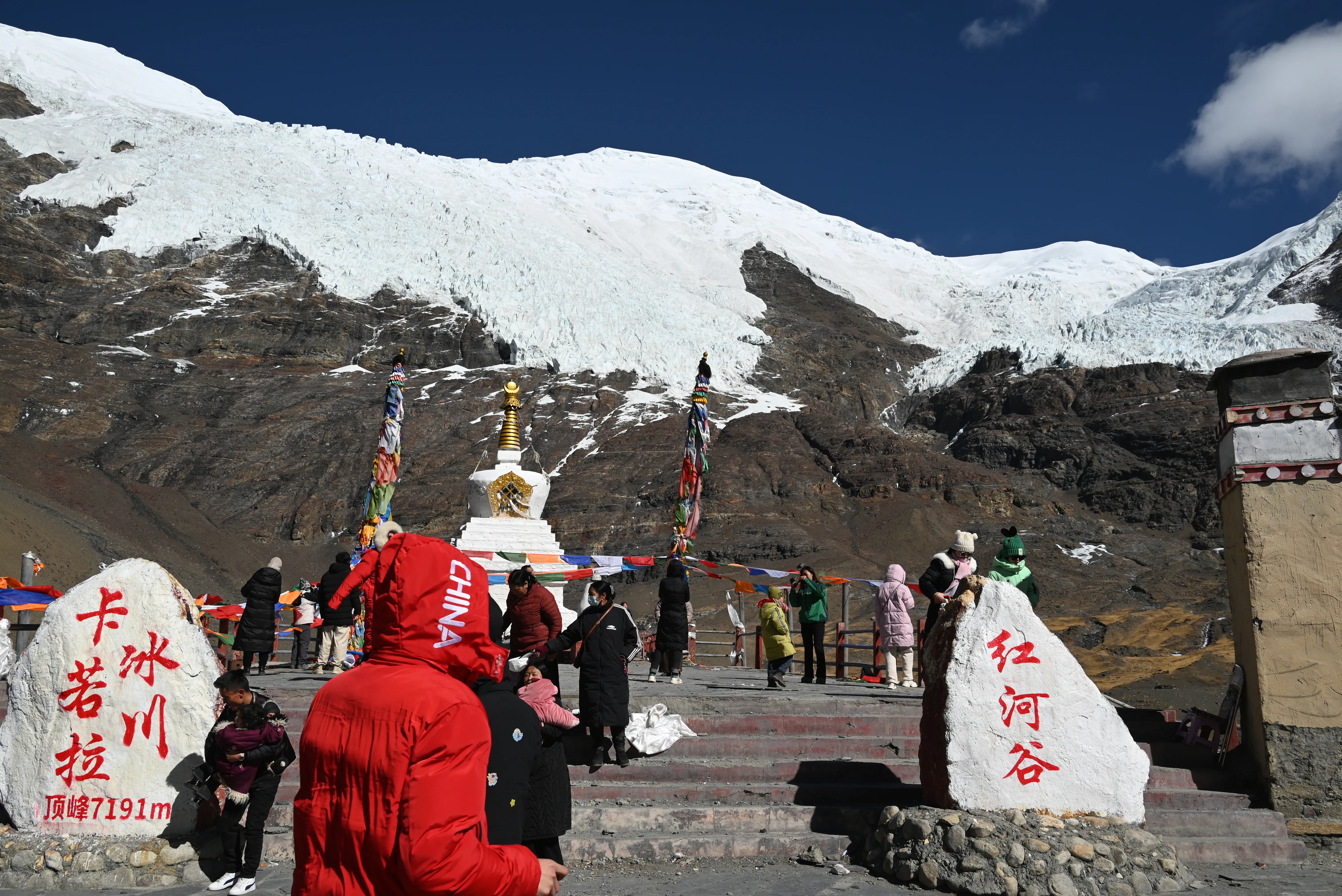 以前冰川是一直伸展到公路边的,而现在随着气候变暖冰川已退缩到半山腰了。